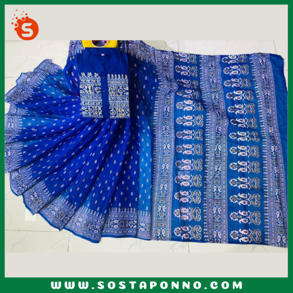 শাড়ি: এই ধুপিয়ান সিল্ক শাড়িটি তার দীর্ঘ ১২ হাত দৈর্ঘ্যের জন্য বিশেষভাবে প্রশংসিত। এতে স্কিনপ্রিন্টের কাজ করা হয়েছে, যা শাড়িটিকে আরও চিত্তাকর্ষক করে তোলে এবং যেকোনো অনুষ্ঠানে পরার জন্য একদম পারফেক্ট।